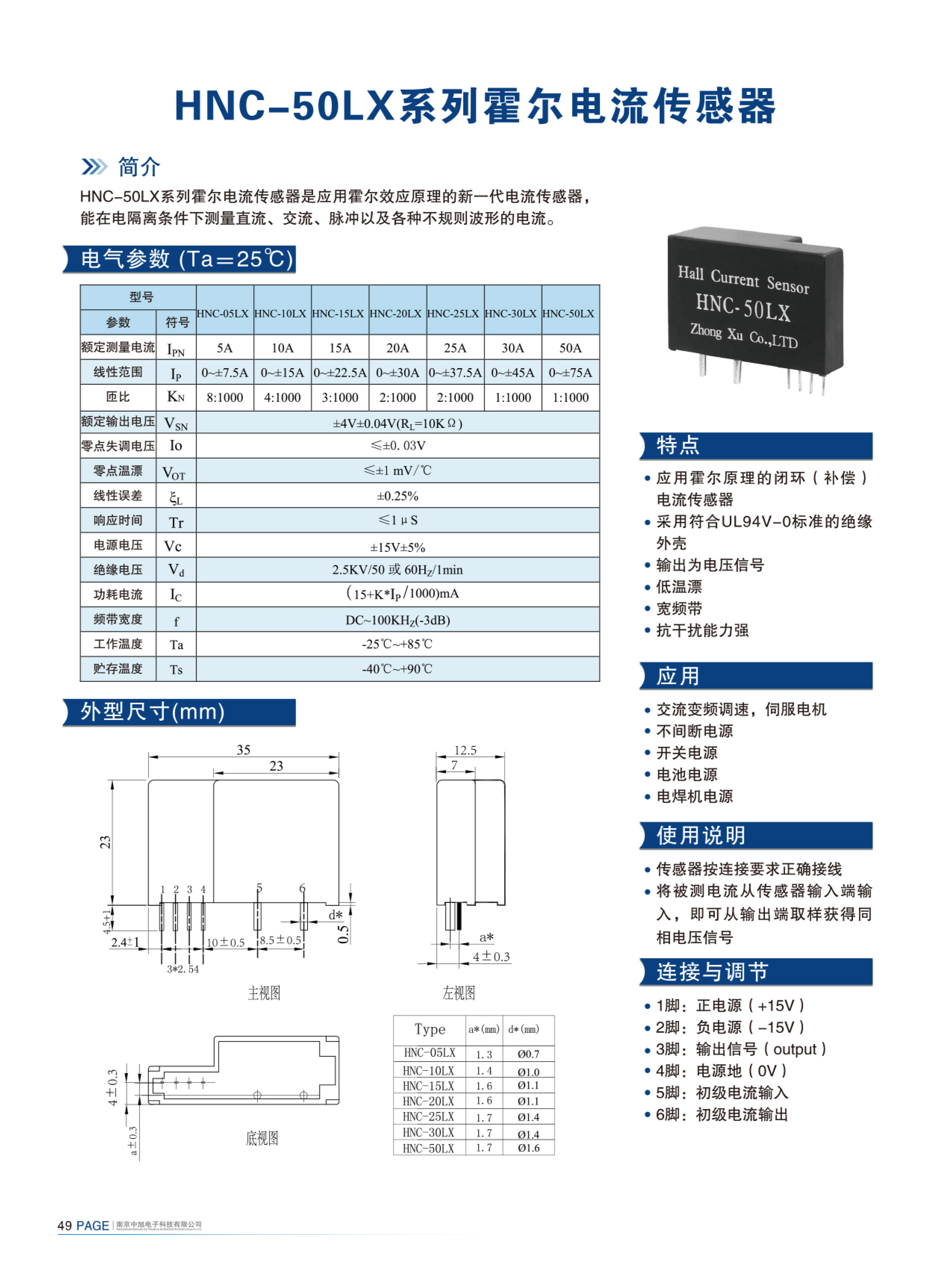 HNC-50LX系列霍爾電流傳感器是應(yīng)用霍爾效應(yīng)原理的新一代電流傳感器,能在電隔離條件下測(cè)量直流、交流、脈沖以及各種不規(guī)則波形的電流。